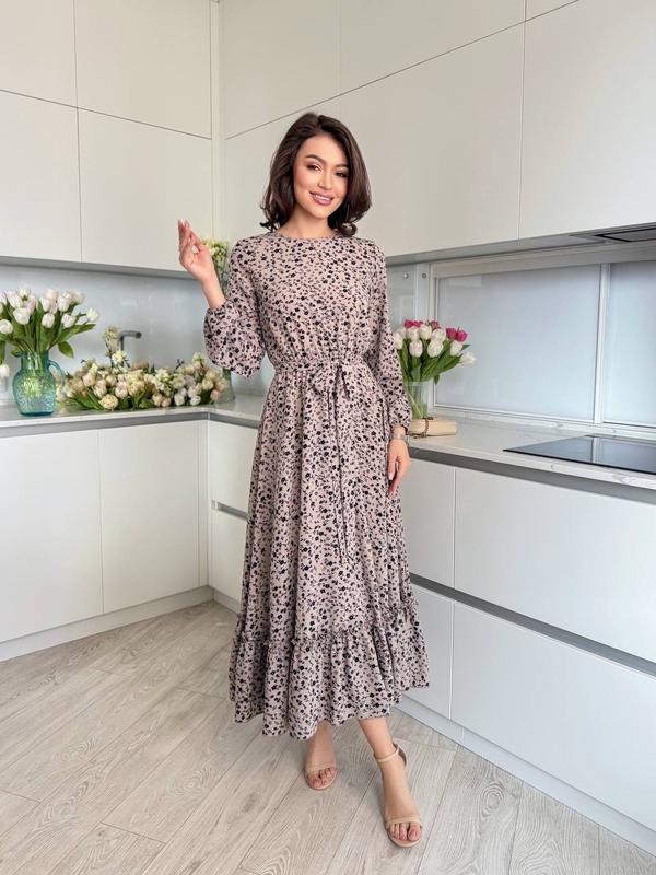 Яскрава квіткова сукня міді софт нарядне плаття з довгими рукавами з поясом