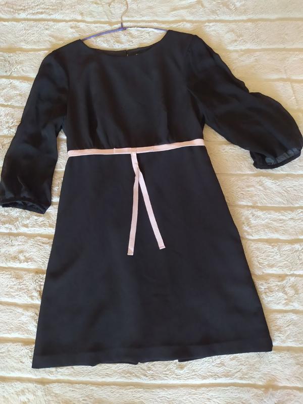 Cукня в идеальном состоянии, как новая. Ткань полиэстер средней плотности, но хорошего качества. Талия завышенная. Платье на подкладке.Рукава из прозрачной ткани на пуговицах. По спинке по линии талии фирменные заклепки. Цвет черный. Сбоку застежка на молнии замеры по платью плечи 39 пол груди 48 пол талии 37 пол бедер 47 рукав 45 длина 86 В акции 1+1= 3 участвуют все вещи по цене 60 грн