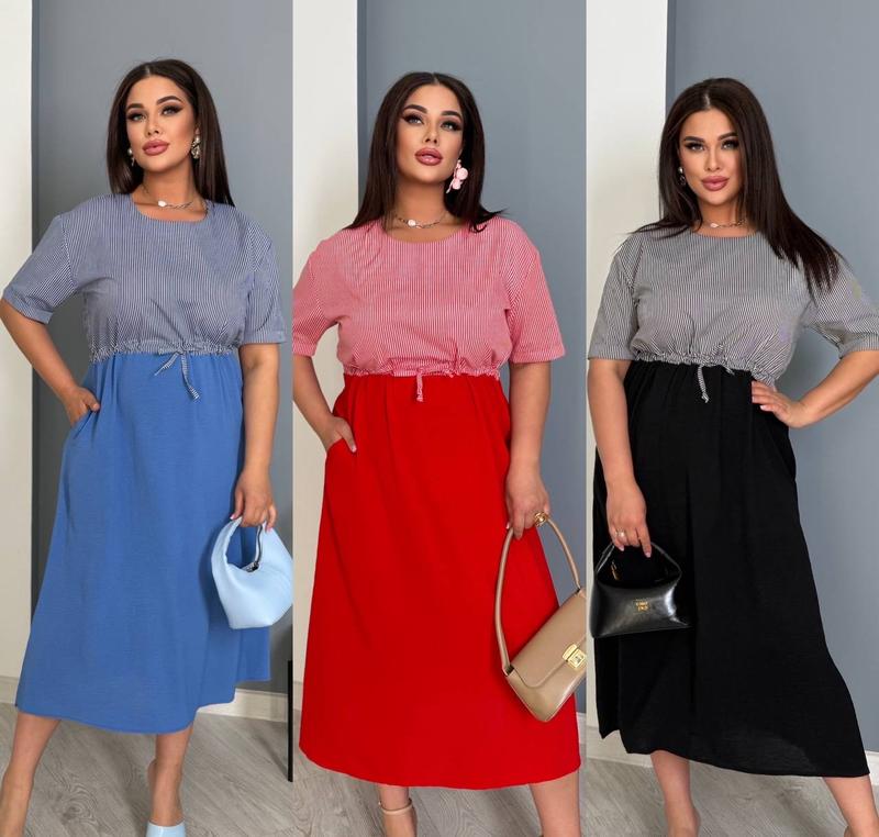 НОВИНКА‼️ Платье Арт 2151 Ткань креп жатка американский, коттон полоска Цвет черный, красный, синий Размер 48-50,52-54,56-58 Платье с коротким рукавом, талия на кулиске, с карманами.