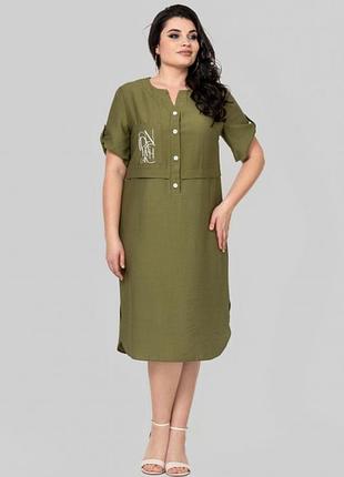 Плаття напівобтислого силуету, відрізне по лінії талії. Виготовлене з тканини льон бохо, тканина має змішаний склад, що дає їй низку переваг, а саме: м'якість, гладкість, висока міцність завдяки нейлону в складі, зносостійкість, повітропроникність, непрозорість, низька зминаність. Рукав ушивний, одношовний, довжина регулюється за допомогою пата та ґудзика. Фігурний борт із застібкою на ґудзики. На правому боці полиці зроблена накладна кишеня. Орієнтовні виміри за готовим виробом: р.50: ОГ - 104см, ОТ - 100см, ОБ - 114см; ширина спинки - 39см; ширина рукава - 20см; р.52: ОГ — 108 см, ОТ — 104 см, ОС — 118 см; ширина спинки — 41 см; ширина рукава — 21 см; р.54: ОГ — 112 см, ОТ — 110 см, ОС — 124 см; ширина спинки — 42 см; ширина рукава — 22 см; р.56: ОГ - 116см, ОТ - 114см, ОБ - 128см; ширина спинки - 43см; ширина рукава - 22см; р.58: ОГ - 120см, ОТ - 120см, ОБ - 134см; ширина спинки - 44см; ширина рукава - 23см; р.60: ОГ — 124 см, ОТ — 124 см, ОС — 138 см; ширина спинки — 45 см; ширина рукава — 24 см; Довжина рукава: 30см; Довжина виробу: р.50,52 — 108 см, р.54,56,58,60 — 113 см. * Заміри можуть відрізнятися від зазначених на +-2 см залежно від особливостей тканини, технічних особливостей пошиття, ступеня зсідання тканини. Рост модели 168 см Довжина рукава 30 см Тип тканини льон бохо Склад тканини віскоза 60%, льон 20%, нейлон 20% Довжина виробу по спинці р.50,52 - 108см, р.54,56,58,60 - 113см Колір оливка Плаття Шейлу Артикул 102364