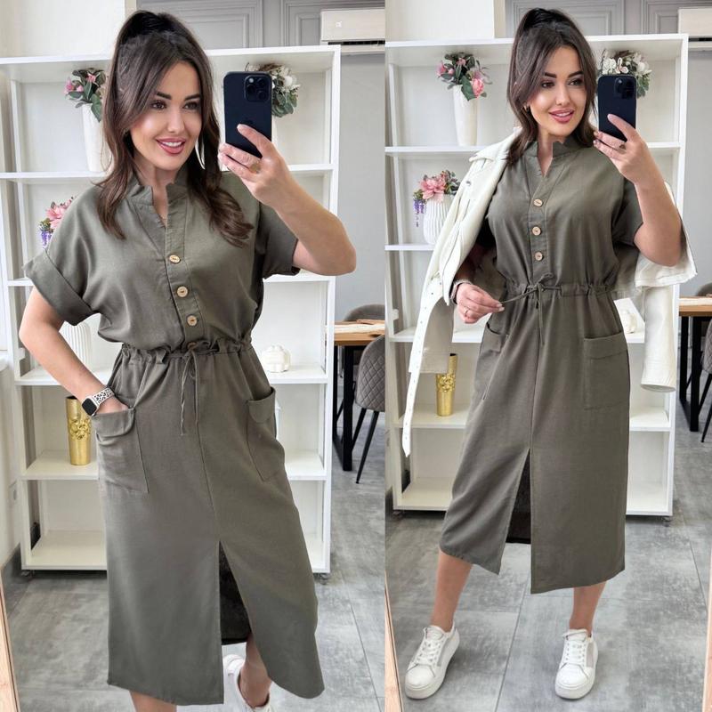 Жіноча лляна сукня плаття міді літня льон Женское летнее платье миди льняное лен фото реал 🏷 Ціна - 944 грн ⠀ ▫️Тканина: льон ▫️Склад: 50% льон, 50% віскоза ▫️Розміри: XS-S(40-42), S-M(42-44), L-XL (46-48), 2XL-3XL (50-52) ▫️Кольори: чорний, беж, моко, хакі, джинс ⠀ Сукня довжини міді, попереду розіз, має дві накладні кишені, спущений рукав, талія регулюється куліской, комір стійка. ⠀ На моделі: S-М(42-44) Параметри: 167см, 94/65/96 ⠀ Модель 185 💙 Підписуйтесь на мою сторінку 💛 💛 Кожен день на Вас чекають новинки 💙 💙 Одягу, взуття та аксесуарів 💛