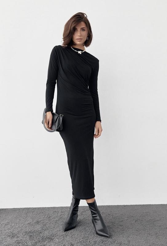 Модель выполнена из эластичной ткани - бифлекс. Мягкая драпировка присутое на правом плечевом шве и с левой стороны полочки. Производитель: Турция Тканина : Бифлекс Замеры: Ширина под проймами рукавов (над грудью) - 41см Длина рукава от горловины - 65см Длина рукава по внутреннему шву - 40см Ширина по стегнам - 41см Ширина по талии/поясу - 36см Длина изделия - 127см