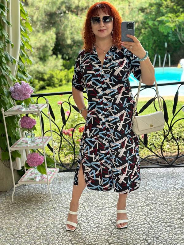 Сукня НОВИНКА💥💥💥 В НАЯВНОСТІ✅✅✅ Код 3709 Тканина: софт. Цвет: черный Размеры: 48-50, 52-54, 56-58, 60-62, 64-66. Длина платья: 123, 124, 125, 126, 127 см. Длина рукава: 37, 38, 39, 40, 41 см. Обхват рукава: 38, 40, 42, 44, 46 см. Замеры готового изделия: 48-50 ОГ 110 ОТ 120 ОБ 128 52-54 ОГ 118 ОТ 128 ОБ 136 56-58 ОГ 126 ОТ 136 ОБ 144 60-62 ОГ 134 ОТ 144 ОБ 152 64-66 ОГ 142 ОТ 152 ОБ 160 На модели размер 48-50❗️❗️❗️ Рост 170 см. ОГ 107 ОТ 84 Ос 107 см✅ Стильное платье-рубашка из софта с принтом ( ткань не тянется). Силуэт платья довольно свободный, в виде трапеции, воротничок отложной. Застегивается на пуговицы по передней планке. Рукав 3/4, можно укорачивать с помощью специального детали на пуговице. По бокам платья разрезы, в боковых швах обработаны карманы.