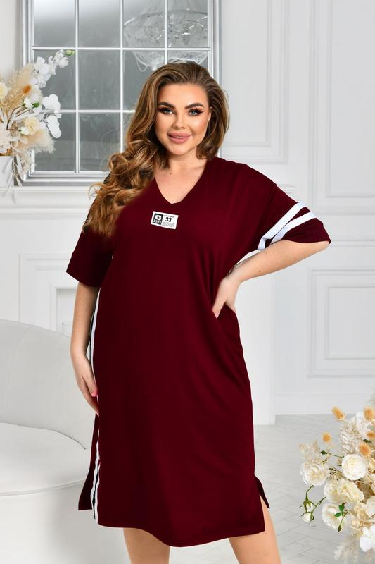НОВИНКА💥💥💥 Сукня Код 3711 Тканина: двонитка. Кольори: бордо Размеры: 48-50, 52-54,56-58, 60-62, 64-66. Длина платья: 103, 104, 105, 106, 107 см. Длина рукава: 44, 45, 46, 47, 48 см. Обхват рукава: 38, 40, 42, 44, 46 см. Замеры готового изделия: 48-50 ОГ 112 ОТ 114 ОБ 116 52-54 ОГ 120 ОТ 122 ОС 124 56-58 ОГ 128 ОТ 130 ОБ 132 60-62 ОГ 136 ОТ 138 ОС 140 64-66 ОГ 144 ОТ 146 ОС 148 На модели размер 52-54❗️❗️❗️ Рост 170 см. ОГ 108 ОТ 85 ОБ 115 см✅ Невероятно стильное платье в спортивном стиле из трикотажа двунитки (растяжимость средняя). Силуэт платья прямой, свободный, вырез горловины V-образный. Рукав кортокый, длиной до локтя. Платье имеет оригинальный декор - нашивку спереди, два лампаса по одному рукаву, два лампасы сбоку. Застежек, карманов нет.