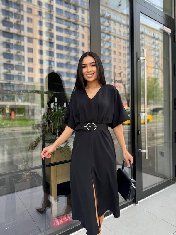 Элегантное креповое платье миди с поясом в комплекте платья с короткими рукавами