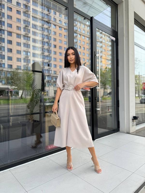 Элегантное креповое платье миди с поясом в комплекте платья с короткими рукавами