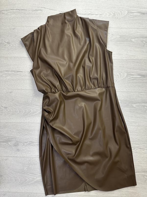 Заміри є на фото. Цвет насыщенный коричневый, молния скрытая на спинке очень длинная, воротничок будет стоять на модели. При росте до 170 будет миди - как раз по колено. Удобное, яркое, скрывает недостатки фигуры, низ отшит с запахом, но так ни разу и не одела. Нове. Реальному покупателю предложат скидку.