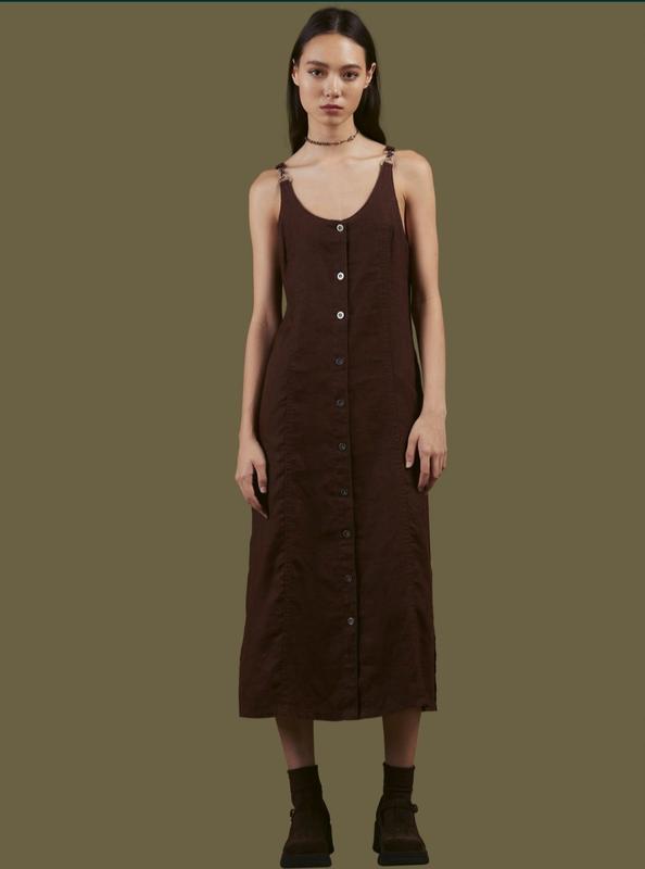 Платье Unif Dress — это невероятное льняное платье длиной до голени с фирменными металлическими крючками на бретелях и застежкой на пуговицы по всей передней части. Рост модели 1,78 м , на ней размер XS. Трендовое льняное коричневые платье. 100% лен! Unif Р. Xs Длина 129см Грудь 44см Талия 39см Бедра 49см