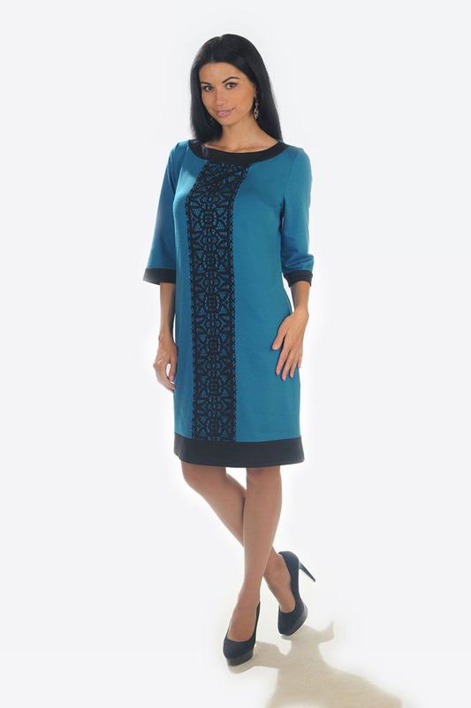 Модное нарядное платье р.46-48 прямого силуэта с круглым вырезом горловины и рукавом 3/4. Перед с кокеткой и контрастной кружевной полосой по центру. Кокетка переда, манжеты рукавов и полоса по низу платья выполнены из однотонного синего трикотажа. Платье отлично ложиться по фигуре и скрывает все недостатки. На платье стоит р.46 ( полномерный)