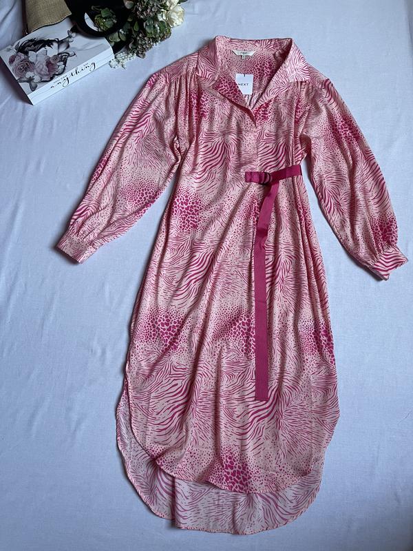 Красивое атласное платье миди в розовых цветах, интересная модель с поясом от next