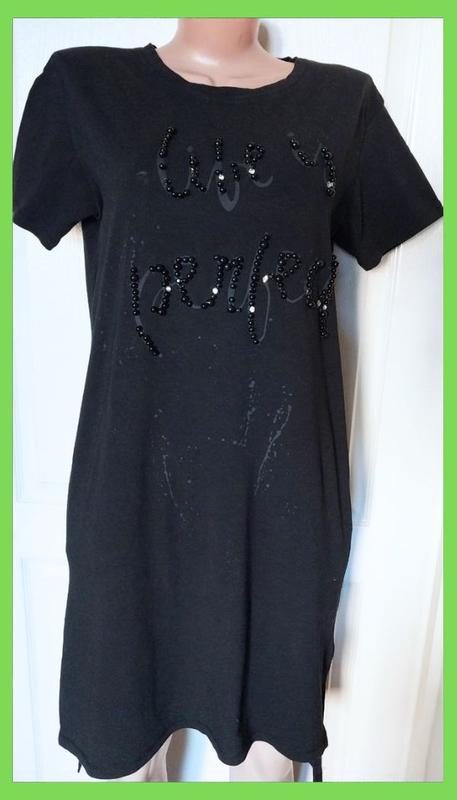 В идеальном состоянии, без нюансов, следы носки небольшие, мягкое, комфортное, спереди рисунок с пришитыми бусинками и стразами, без пятен, не тонкий хлопок с эластаном. Размеры: длина спереди 88см, сзади 98, ПОГ 48, ПОТ 49, ПОБ 51, низ 54, разрезики боковые 9см, плечо 14, ширина плечей 46, длина рукава 16 см. Доставка любым оператором, или встреча Киев
