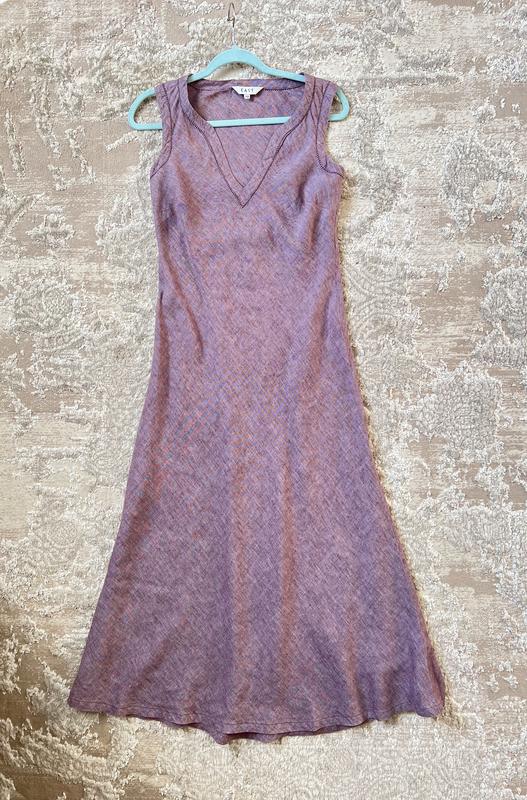 East- сукня виконана з льону у красивому лавандовому кольорі, розмір 10( заміри 52см-ширина у грудях, 133см- висота; ) має відмінний стан, з витонченими виточками; Бренд East - це британська марка одягу, яка спеціалізувалася на жіночому одязі в стилі бохо, етно та casual. Вона була відома використанням натуральних тканин, вишивки та етнічних мотивів. Сукні, спідниці та блузи мали вартість у діапазоні £50-£200 (залежно від матеріалів та дизайну).
