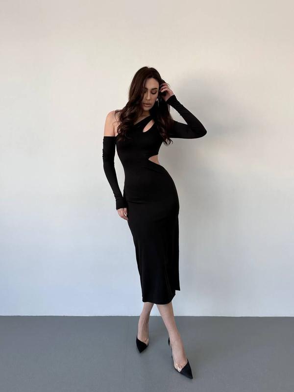 Платье миди длинная черная с асимметричными вырезами длинные рукава открытое плечо разрез...