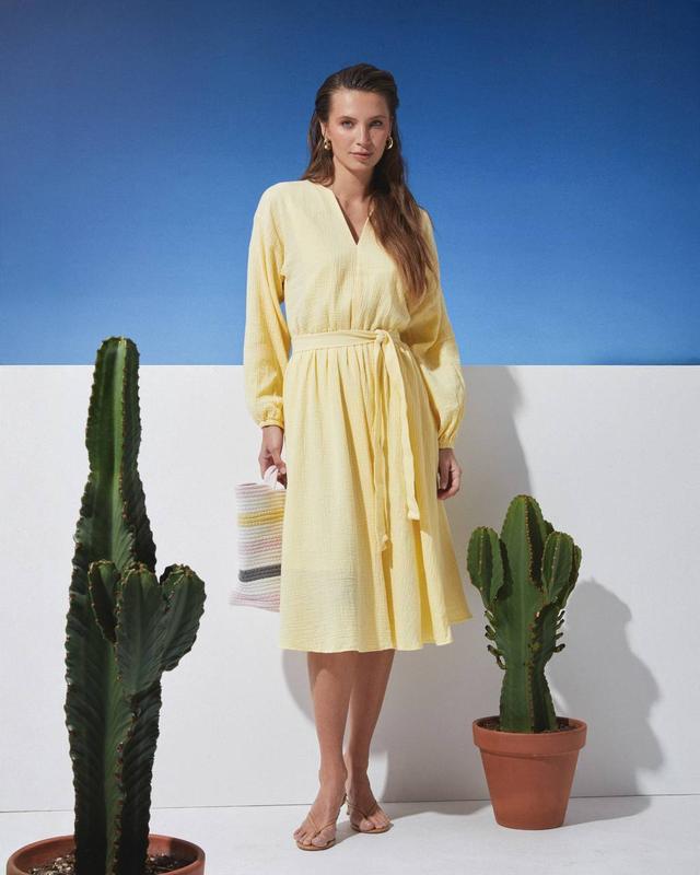 Женское платье из муслина с длинным рукавом миди с поясом летнее а силуэт платья 2283.6371
