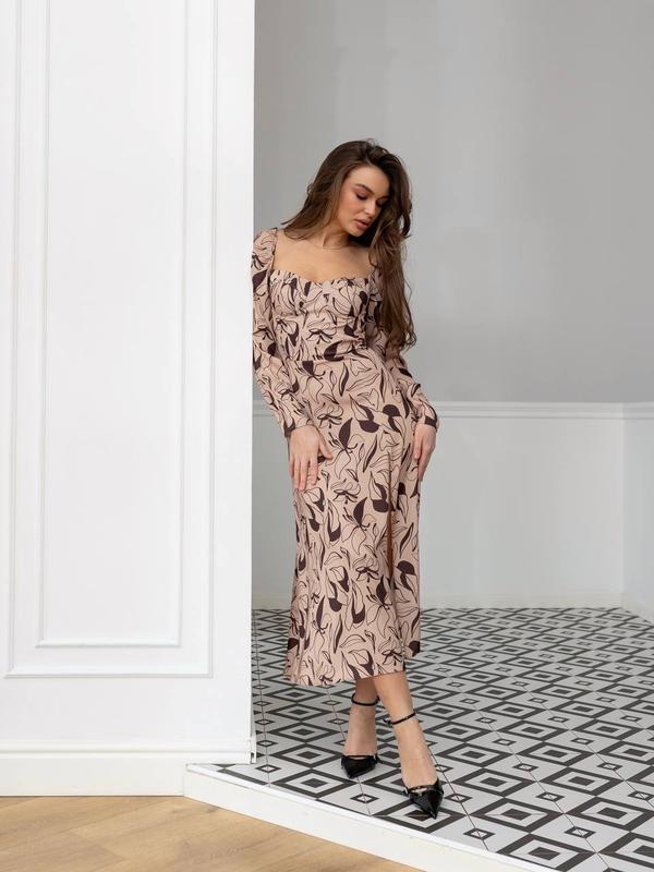 Элегантное платье из принтованного шелка с изящной чашкой. Идеально подчеркивает фигуру, создавая утонченный и женственный образ. Легкая ткань хорошо струится, даря комфорт и уверенность в каждом движении. Идеальный выбор для особого случая или стильного повседневного выхода. ▪️size: 42, 44, 46 ▪️colors: Молочный-черный Коричневый цветок Коричневый лист ▪️textile : даблшовк ▪️art: Anfisa