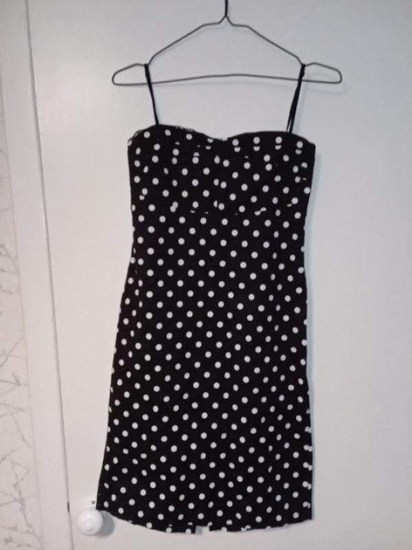 бутылка черная в белый горошек, хлопковая,новая,но без бирки,на бретелях,по спинке на резинке,сбоку на молнии,е хлястики под пояс, сзади распорка,два оформлен складками и небольшим черным кружевом,