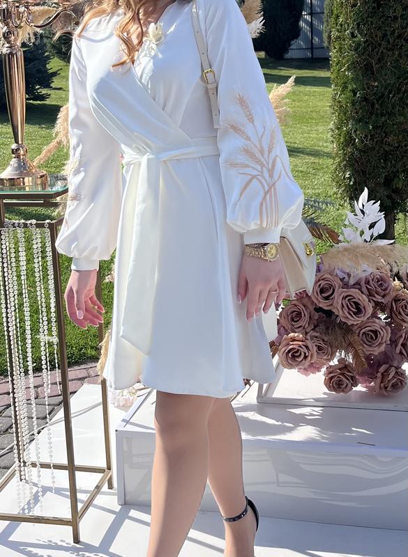 ✨ Описание: Стильное платье молочного цвета с запахом, подчеркивающим фигуру. Роскошные широкие рукава с нежной вышивкой в виде колисков добавляют образу элегантности. ✅ Детали: • Ткань: приятная на ощупь, не просвечивается • Длина: выше колена • Рукава: объемные, на манжетах • Пояс в комплекте ✅ Состояние: новое/в идеальном состоянии ✅ Размер: уточняйте в сообщениях Идеально подходит для торжественных событий, фотосессий и особенных моментов!
