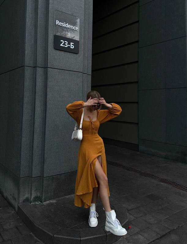 Женское платье миди с длинными рукавами декольте закрытой спинкой со шнуровкой и разрезом...