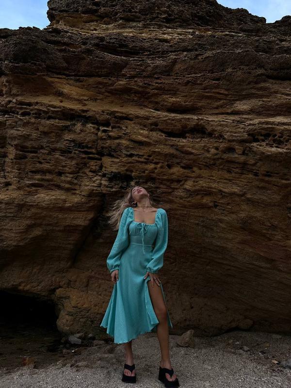Женское платье миди с длинными рукавами декольте закрытой спинкой со шнуровкой и разрезом...