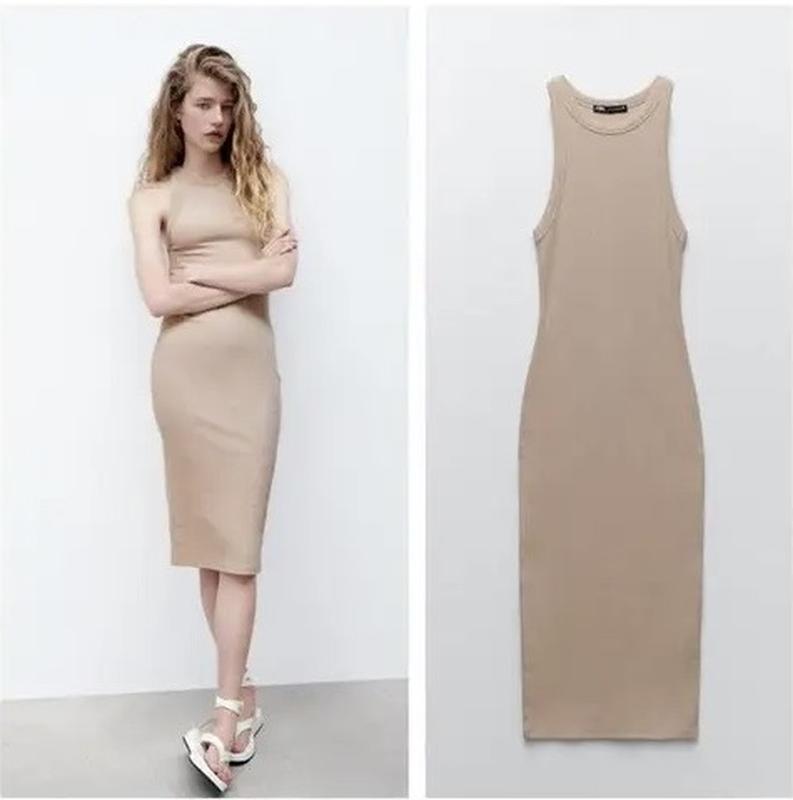 Платье-майка миди в рубчик без рукавов с высоким воротом, телесного цвета, бежевого цвета, размер M Длина 110 Пог 31-53 Тянется