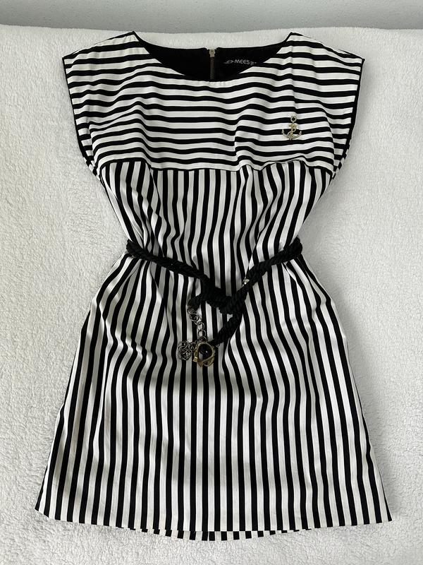 Трендовое женское платье в полоску черно-белое Имеет подкладку у карманы невидимки Выполнена в морском стиле Длина изделия- 82 см Ширина плечей- 49 см Полу обхват груди- 45 см Полу обхват талии- 40 см Полу обхват бедер- 52 см