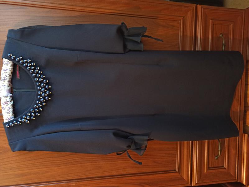 Платье средней длины, прямое, с красивыми рукавами, декольте оформленное бусинками