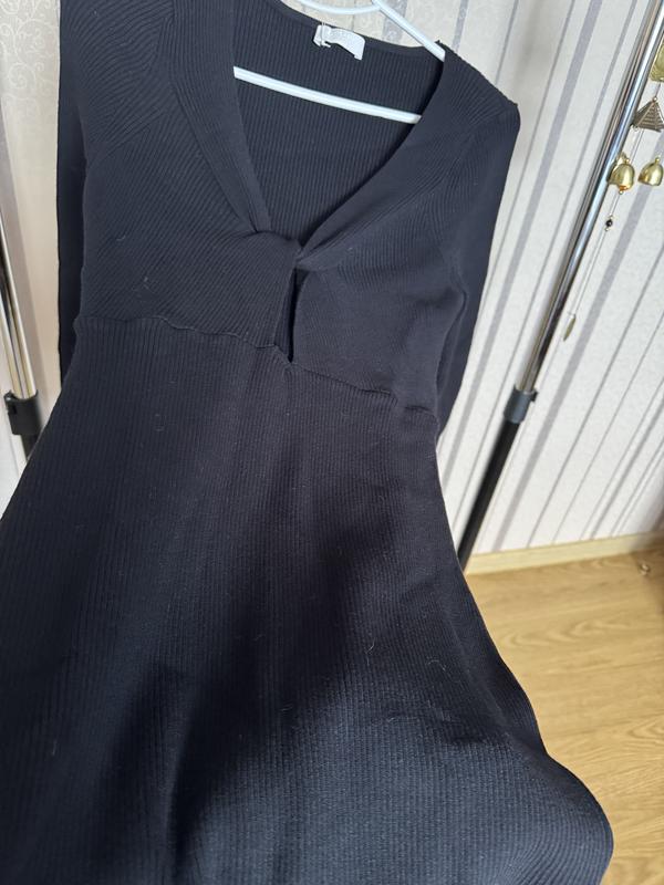 Сукня чорна в рубчик з довгим рукавом Має акцент на грудях Склад 70% віскоза 30% поліамід Довжина 89 см Ширина по грудях 40 см Добре тягнеться Рукав від плеча 67 см