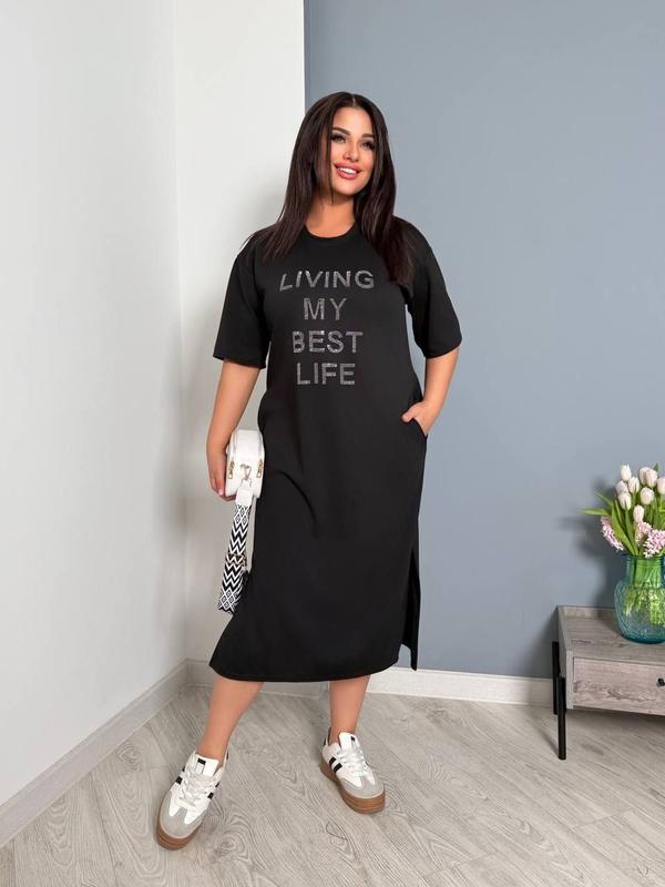 Платье-рубашка батальная серия Модель:250 Размеры: 48/52; 54/58; 58/62 Тканина: лакоста Цвет: черный Оверсаймное платье-футболка длинная с разрезами и карманами с надписью LIVING MY BEST LIFE (живую свою лучшую жизнь ) - это стильный и комфортный вариант для тех, кто ценит моду и удобство. Спущенный рукав добавляет уверенности расслабленности, а боковые карманы делают платье еще более практичным. Замеры: 48/52 ОГ-115 54/58 ОГ -124см 58/62 ОГ-130 Длина -118 см