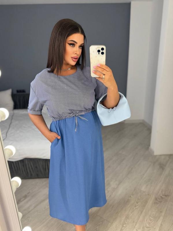 Платье арт. ha2. 2151 Ткань: креп жатка американский, коттон полоска Цвет: черный, красный, синий Размер: 48-50, 52-54, 56-58 Платье с коротким рукавом, талия на кулиске, с карманами