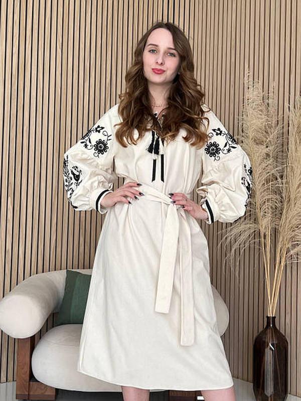 Женское платье - вышиванка. Тканина - домотканне полотно. Ткань плотная и не просвечивается. Состав ткани - 80% хлопок, 20% полиэстер. Цвет ткани - бежевая. Вышивка машинная, гладь. Платье идет с пояском, также можно носить без него. Модель платья - трапеция. Размеры в наличии - S, М S размер ОГ по телу в диапазоне 84-90 см ОБ по телу до 98 см Ширина под руками по изделию 50 см Ширина в стегнах по виробу 55 см Длина 116 см Длина рукава от шеи 68 см M размер ОГ по телу в диапазоне 88-104 см ОБ по телу до 105 см Ширина под руками по изделию 52 см Ширина в стегнах по виробу 56 см Длина 117 см Длина рукава от шеи 68 см Отправка по Новой почте, Укрпочта, Мист. Оплата - наложенным платежом (предоплата100 грн), на карту или можете оформить безопасную покупку через шафу.