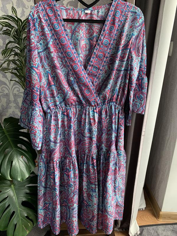 Легкое, воздушное, яркое платье длины миди. В талии на резинке, лиф выполнен на запах. Низ благодаря волану, пышный и объемный. Ткань легкая, глянцевая, в составе вискоза. Узор пейсли, в котором гармонично соединились бирюзовые и розовые оттенки. Стан идеален. Размер не указан. Замеры: объем в груди 100/104, в талии 70/90, в бедрах 116, рукав 40, длина от талии 65, полностью 105.