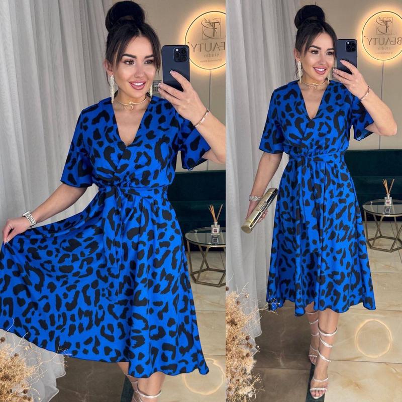 Женское летнее миди платье в леопардовый принт с поясом софт