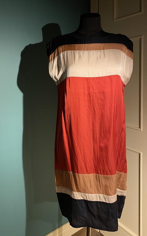 Багатокольорова сукня TRULY by Part Two з великими горизонтальними смугами червоного, білого, бронзового та синього кольорів. Виготовлена з м’якої тканини, що гарно структурується. Має підкладку, проте, незважаючи на два шари, залишається легкою та повітряною. Склад: Верх — 63% віскоза, 37% бавовна Підкладка — 100% ацетат