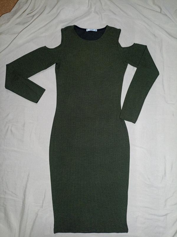 очень красивое платье в мелкий рубчик, цвет хаки,с изнаночной стороны черный, состав ткани не знаю,срезана бирка , хорошо сядет на 36-44 ,по бокам есть маленькие разрезы их можно зашить так как распорото по шву, рукав без манжета просто срез без строчки, очень красиво смотрится