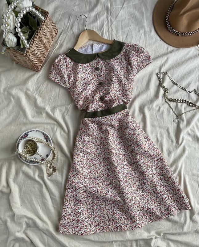 Талія ззаду на резинці, спереду – зелений тканинний пояс. Розмір не вказаний, на хс сидить гарно (можна й на маленьку с). Матеріал на дотик – поліестер. Стан хороший, але є нюанс (останнє фото) – можна підшити, якщо є бажання, але на вигляд загалом не впливає. Першу світлину взяла з інстаграму, де замовляла.