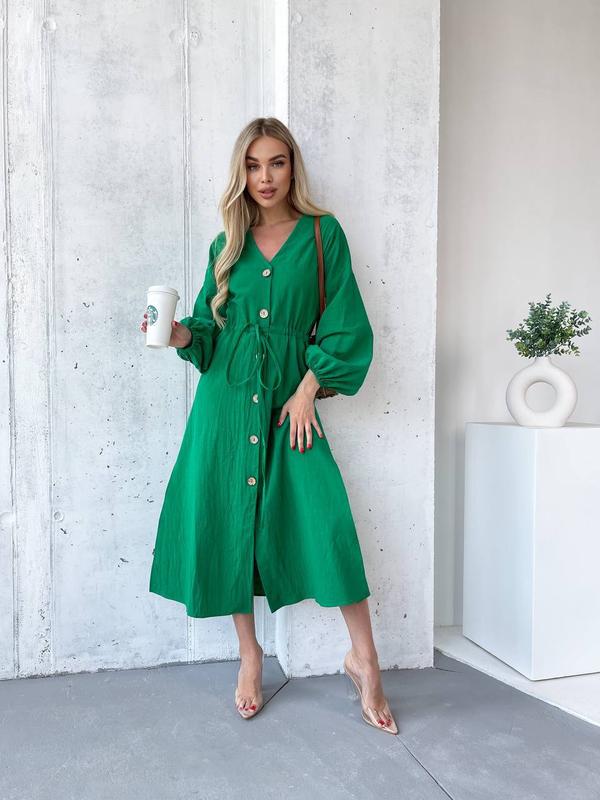 Сукня ґудзики 2932 Тканина льон. Пуговицы древесные. Размер oversize 42-46 в малиновом, зеленом и белом цвете. Длина 122см Обхват груди 100см Талия на кулиске от 60 до 82см Бедра 106см Цена 900грн