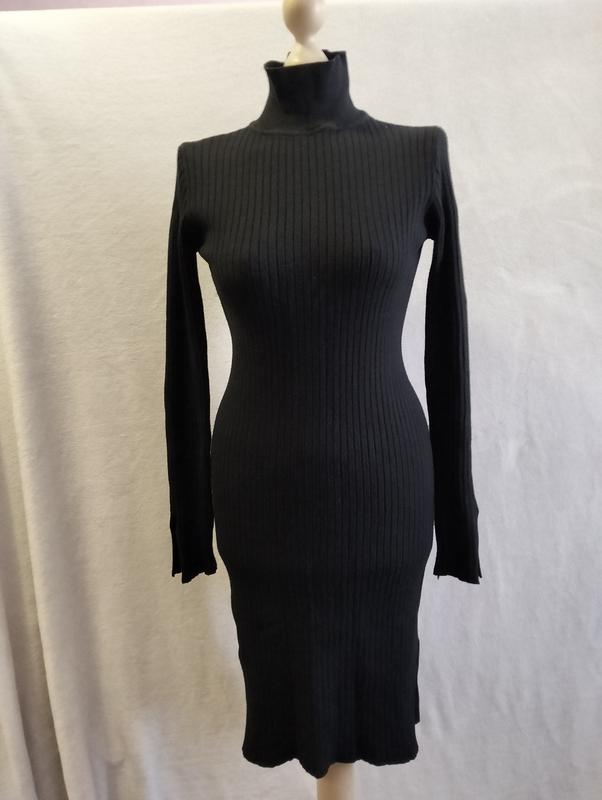 платье приталенное, черного цвета в рубчик, с небольшими разрезами на рукаву, и небольшие разрезы снизу, хорошо тянется. Полуобъем груди - 41см полуобъем талии - 33см полуобъем бёдер - 34см длина изделия - 95 см длина рукава - 64 см