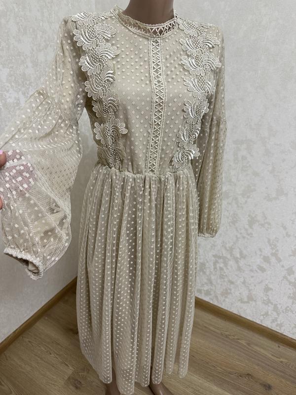 Красивое нежное кружевное обонятельное платье.. По талии резинка. Застегивается сзади на пуговицу Замеры: ПП 40 ПГ 50 ПТ 36-46 ПС 65 Длина 117 Рукав 62