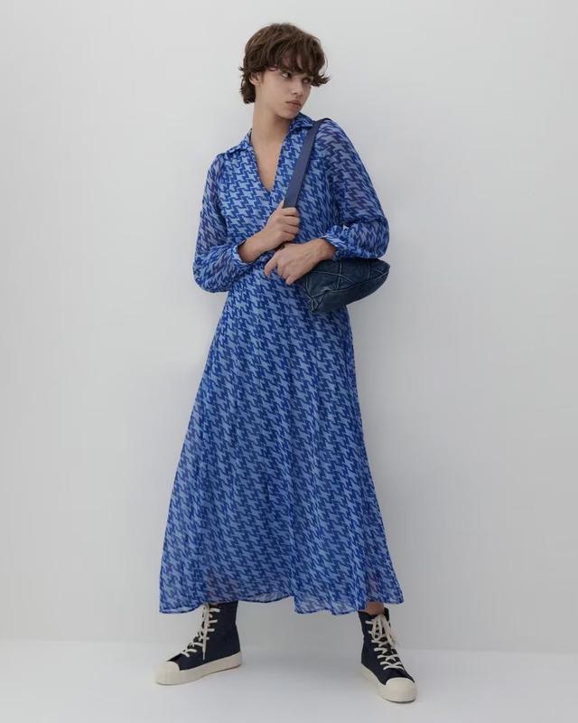 Сукня міді з легкого струмливого матеріалу, приталена на талії, з V-подібним вирізом і коміром-сорочкою. Довгі рукави, розкльошена спідниця. Принт — класична гусяча лапка в синьо-блакитних відтінках. Бренд Reserved, розмір S Стан сукні ідеальний