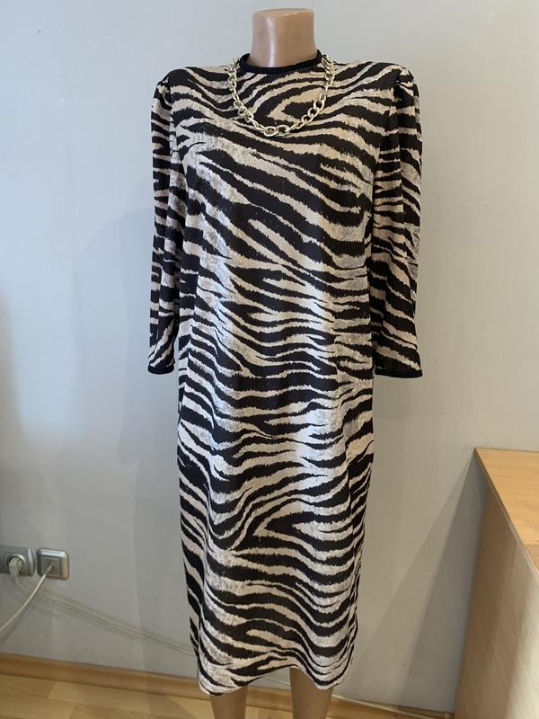 Стильное оригинальное платье из тонкого трикотажа в ярком принте зебра. Классический ровный фасон, можно носить с черным поясом. Мягкая приятная ткань, ручная работа. Пог 54 см, длина 102 см, рукав 45 см, плечи 40 см