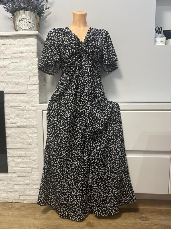 Это женское платье бренда Boohoo. Она имеет черный цвет с мелким белым цветочным принтом. Платье с короткими расклешенными рукавами, V-образным вырезом и легко приталенным силуэтом. Она длиной до щиколотки или чуть выше (макси-длина), с мягкой драпировкой на груди. • Размер: UK 14 (XL) • Длина: 126 см • Обхват груди (ПОГ): 51 см • Талия: 42 см • Стегна: 57 см Не забудьте подписаться на мой профиль,тут всегда можно найти большой выбор одежды, обновление каждую неделю и действуют всегда скидки