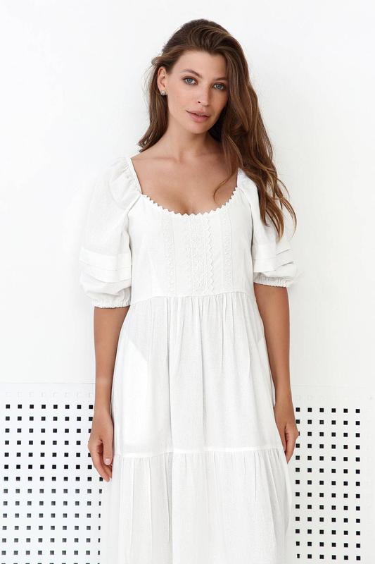 Платье из 100% льна украшено кружевом. Имеет потайную застежку, карманы.