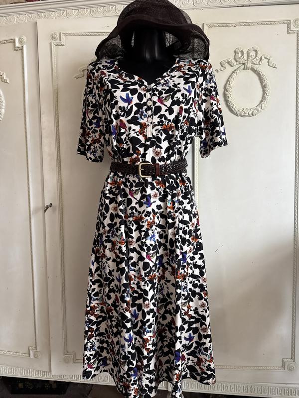 Отличное трикотажное платье миди от Peter Hahn. Состав:органик коттон-100/. Модель с широкой юбкой, не отрезное по талии, застежка на комди на три перламутровых пуговицы. Без карманов, без подкладки. Размер по наборке-44. Замеры: длина-110 см, ПОГ-52 см, ПОТ-46 см, ПОБ-156 см. Отлично смотрится с поясом и без. (Пояс в комплект не входить).