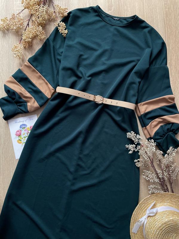 Шикарна сукня глибокого смарагдового кольору, з бежевими вставками на рукавах Вільний крій зі спущеним плечем, рукав пишний, з манжетом Можна носити з поясом, можна як оверсайз (ремінь, що на фото, не входить в комплект) Заміри: Пог 56-57 Пот 54-55 Поб 58 Рукав від шиї 71, від плечового шва 41 Довжина 136