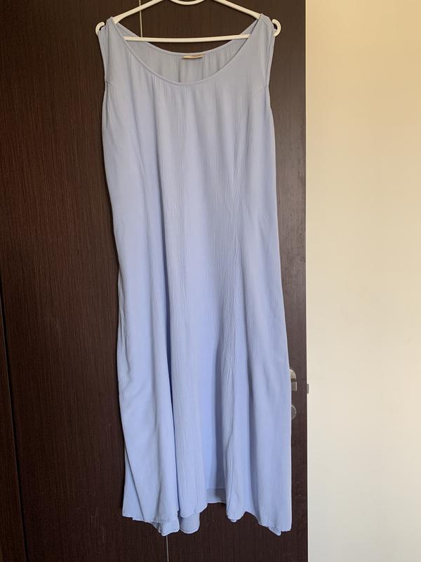 Трендовое макси платье из натуральной жатои мягкой вискозы. Красивого голубого цвета. Удобный, комфортный минималистичный крой, Размер 18/46-20/48. Нюанс: Сзади на подоле дви почти непомощные малышки -фото 6 П. о. грудь 63 П. о. стегон 72 П. О. талии 60 Длина платья 120 ● Обмену и возврату нет, перед заказом проверяйте все измерения. По запросу делаем дополнительные фото. ● Оплата на карту Приватбанка 100% суми. Наложенного платежа нет. С Безопасной оплатой НЕ РАБОТАЮЩИМ. ● Отправка Новой или Укр-почтой.