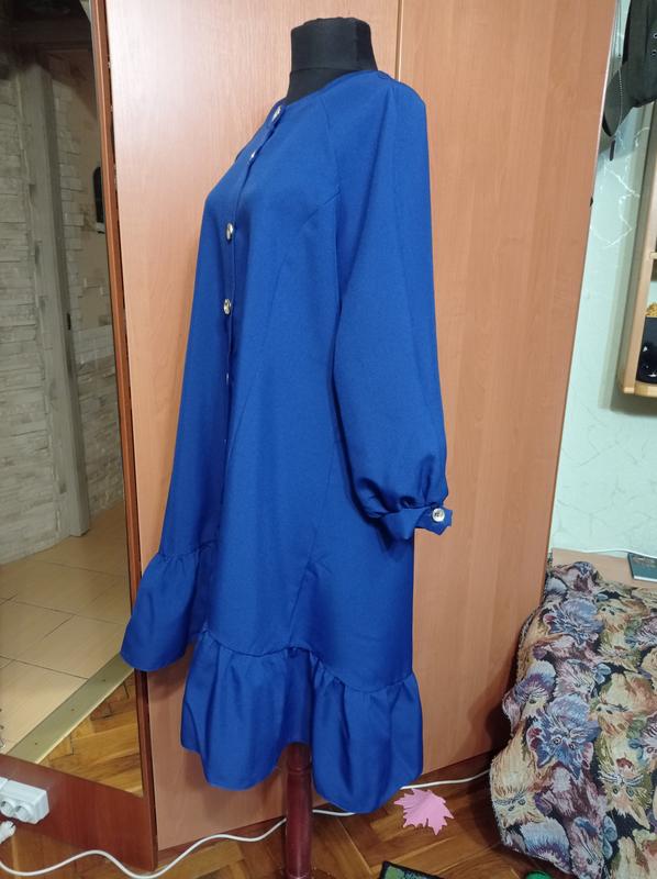 Модное платье украинского производителя в идеальном состоянии. Крой - колокольчик, распашонка, сзади длиннее, ткань не тянется, карманов нет, цвет синий, электрик, внизу волан, рукав 3/4, объемный, золотистые пуговицы. Размер 50 Длина - 93см - спереди, 119см-сзади; длина рукава -61см от воротника; ПО бицепск - 21см; ПОТ - свободно; ПОГ - 57см; ПОБ - 70см; Фото выполнено на манекене 34 размера, и принимайте это во внимание. Возвращение или обмен нет, пожалуйста, обдумывайте, делайте покупку. Оплата и доставка: Оплата на карту ПриватБанк - 100%