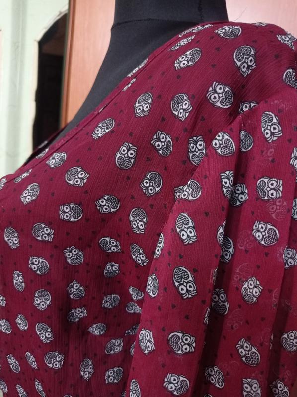 Гарне, вільне, ефектне плаття, в дуже хорошому стані. Принт совушки, колір бордовий, по талії резинка, на трикотажній підкладці, рукава - прозорі, без кишень. Розмір 46/18, але дивіться заміри: Довжина - 98см; Довжина рукава - 58см; гирина плечей - 44см; ПОТ - 52+см; ПОГ - 53см; ПО по стегнах - вільно. (виміри в спокійному положення, без натяжок). Фото зроблено на манекені 34 розміру, беріть це до уваги. Можете вибрати до купівлі собі подарунок (лоти "Подарунок"), дивіться мої оголошення. Повернення або обміну немає, будь ласка, обдумано робіть покупку. Оплата і доставка: Оплата на карту ПриватБанк Ощадбанк - 100% Якщо користуєтесь "Безпечна оплата" (через Шафа), прошу втричі уважно продумувати покупку, задавати питання, просіть фото, щоб не повертати, зобов'язуючи продавця сплачувати доставку вам і назад, давайте поважати один одного! Відправка Новою поштою, Justin, Розеткою і Укрпоштою. Пересилка за рахунок покупця.