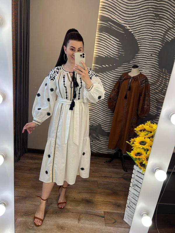 невероятно красивое платье - вышиванка с первой минуты попадает в наши сердца и гардеробов, она изготовлена из искусственного льна высокого качества, декорированного в высшей степени яркой и насыщенной вышивкой платье прямого кроя с круглым горлом, изящным разрезом на груди со шнурочками-завязками на вороте, эффектными пышными рукавами на манжетах с пуговицами, удобным поясом в комплекте, отрезной талией, интересными защипами спереди и чуть ниже по бокам платье выгодно будет смотреться на девушках с разными типами фигур, создаст хорошее настроение и займет достойное место в вашем гардеробе размер 44-48 длина 118 см, объем груди по изделию 100 см, длина рукава от шеи 66 см код 88132 арт.да085