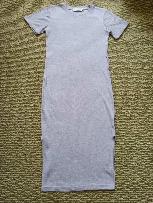 платье длины миди в рубчик серого цвета на размер s-m, по бокам имеет разрезы, отличное качество, состояние идеально