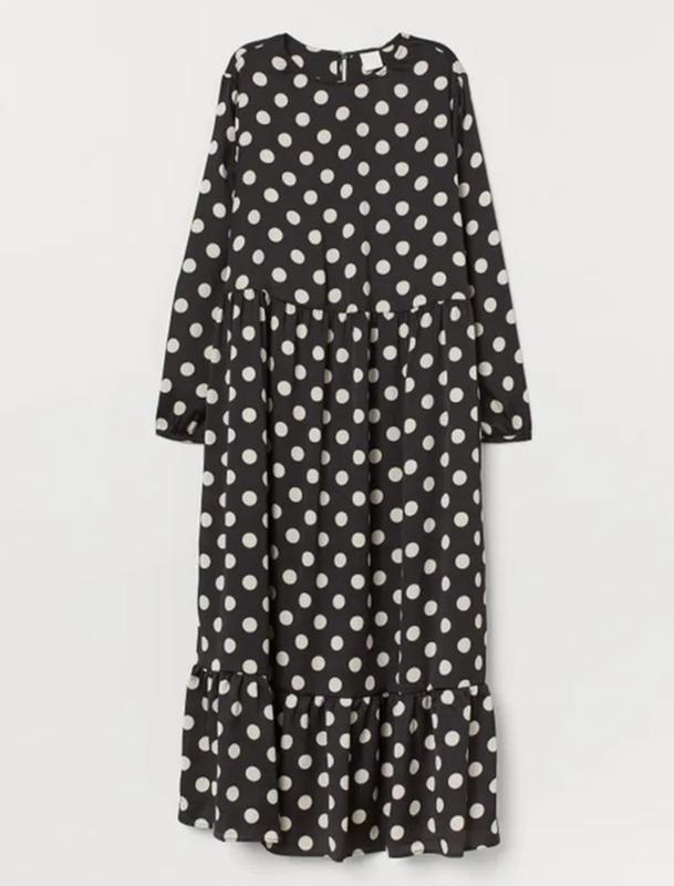 Легкое женское платье бренда H&M. Цвет черный, в крупный белый горох. Длина-127см.Плечи-43см.Рукав-59см.ПОГ-61см.ПОТ-55см.ПОБ-87см. Размер указанного Л, но будет как оверсайз, подойдет на наш 50-52. Покуспала на Шаффе, одела один раз, но оказалось слишком большой.